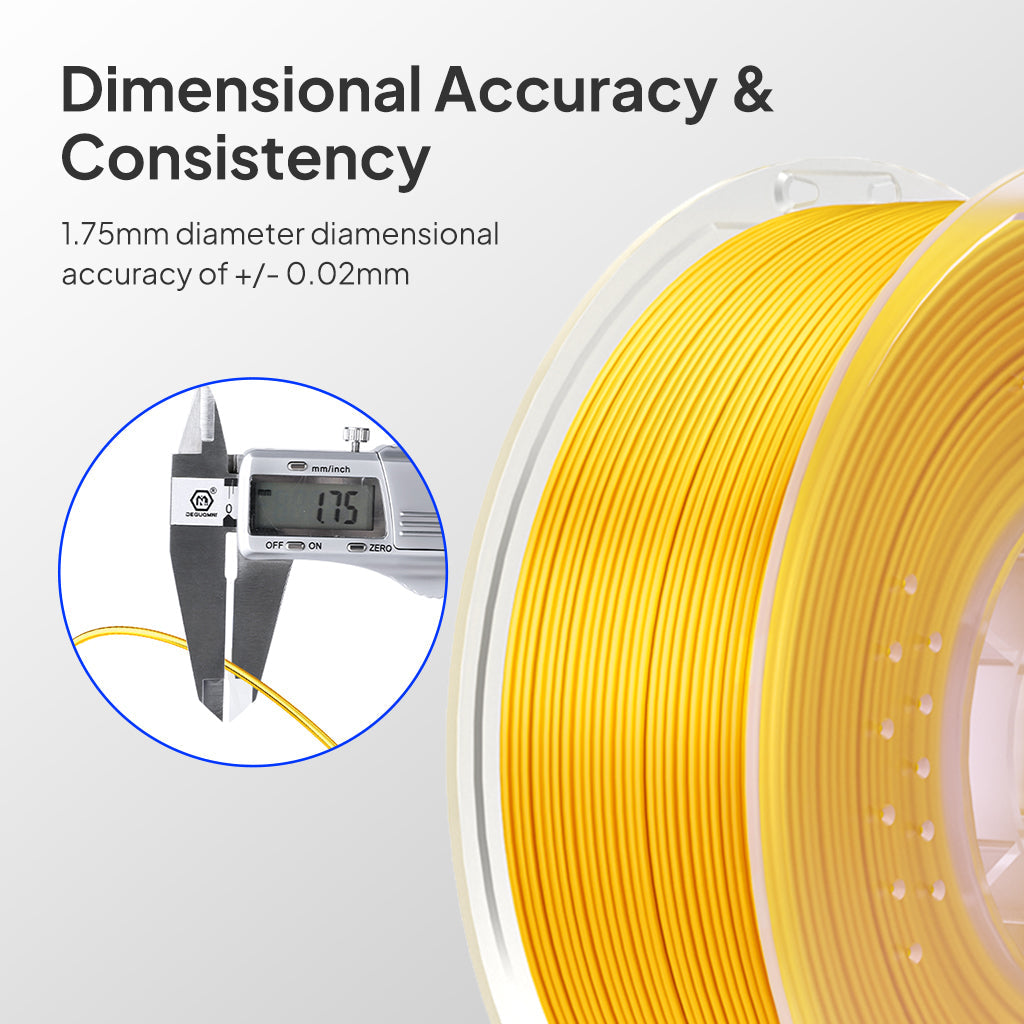 Strict tolerances ensure consistent dimension of the 1.75 mm PLA filament for smoother and more stable printing, with a dimensional accuracy of +/- 0.02 mm.
