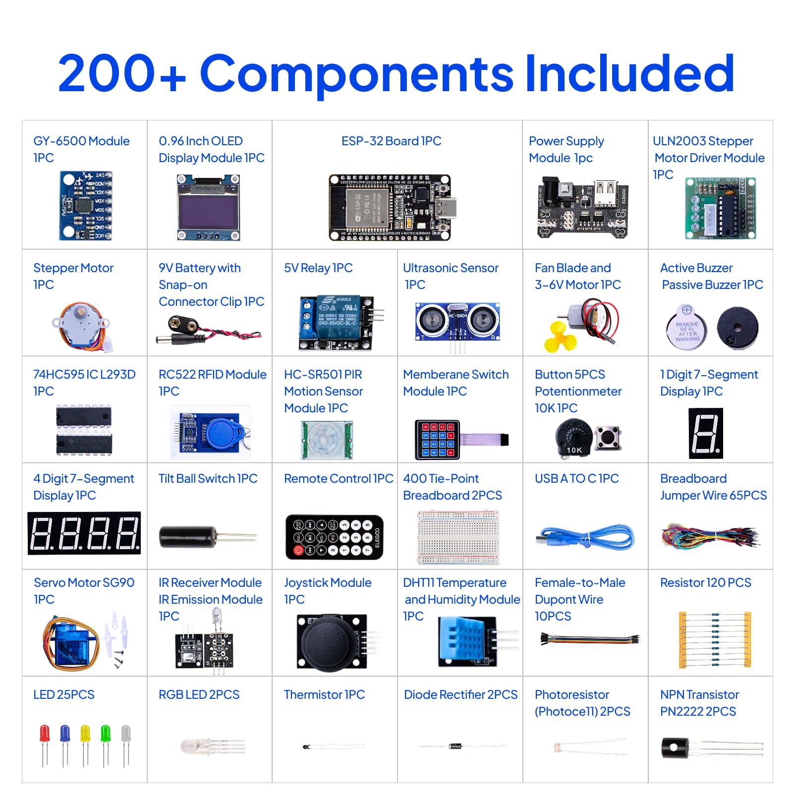 • Quality & Great Support: Elegoo is committed to quality. We provide a clear, detailed tutorial guide, refined code, and a well-organized component kit. All modules are carefully selected for reliability and ease of use. Our dedicated technical support team and active online community are ready to help you succeed in your learning journey.