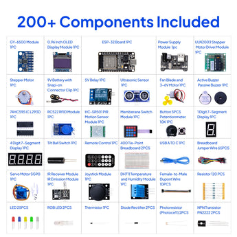 • Super Starter Kit: This kit contains over 35 different modules and electronic components, including sensors, displays, motors, and input devices. From LEDs and buttons to an OLED screen, servo motor, and keypad, you have everything needed to explore a vast range of projects in one box.