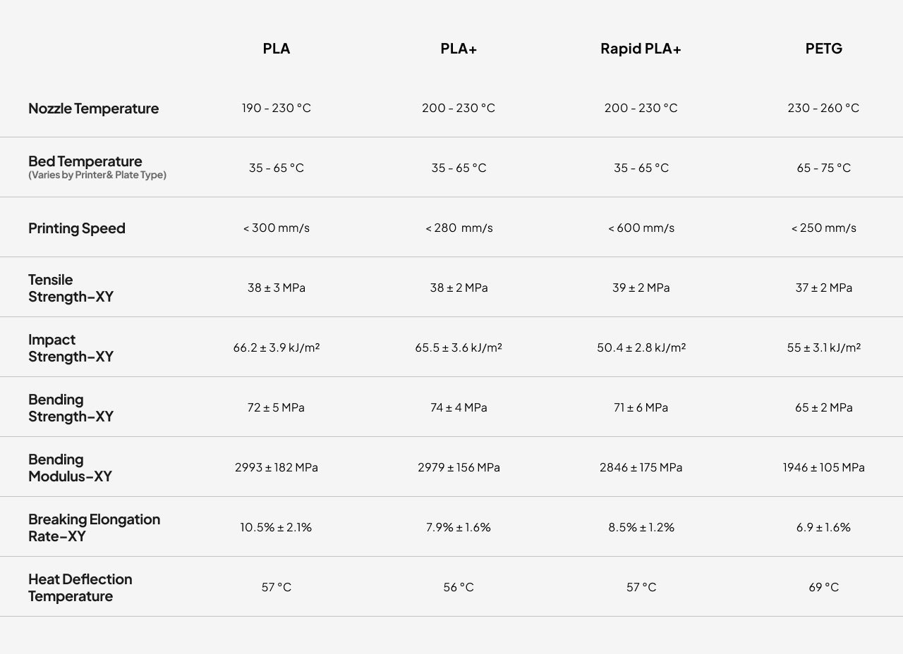 Find your perfect match. Whether you value effortless printing, incredible strength, blazing speed, or tough durability, our range of PLA, PLA Plus, Rapid PLA Plus, PETG, and Rapid PETG has you covered.